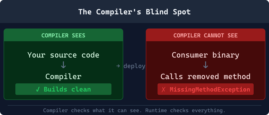 These are not rare edge cases. They are the normal state of any system with more than one service, any persistence layer, or any public API surface. The compiler success guarantee is narrow. The runtime failure surface is wide. This gap: the delta between what the compiler checks within the solution boundary and what the runtime encounters across all consumers: is The Compiler's Blind Spot.